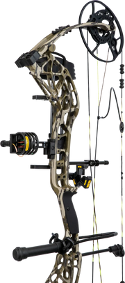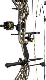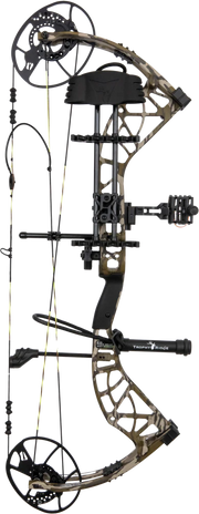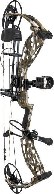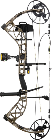 Includes Fatal 4-Pin Sight with Picatinny mount, Whisker Biscuit V Rest with Integrate Mounting System®, Snubnose Stabilizer, 5-Spot Quiver, peep sight, and wrist sling