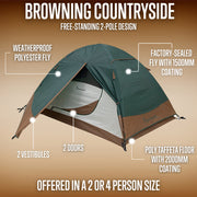 The Browning Countryside 4 Person Tent in brown and green is simple to set up, making your outdoor adventures hassle-free. It features two doors and a full coverage fly with two vestibules, providing extra space and protection from the elements. Inside, you'll find a mesh storage pocket and a gear loft to keep your essentials organized. With factory-sealed fly and floor seams, this tent offers reliable weather protection to keep you dry and comfortable throughout your trip.