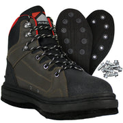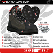 The Deep Eddy felt wading boots give you the stability and traction needed when fly fishing in moving water on slick rocks or even muddy river banks. Coupled with the Rock Jam™ toe cap this wading shoe gives you the reinforcement you need where you need it most for lasting protection. Additionally, the reinforced stiff midsole provides a sure and solid step every time on uneven surfaces. The Deep Eddy felt wading boots also features recessed stud insert points for maximum traction on slick rocks or muddy banks. Lastly, the steel Slick Eddie studs are included and the Deep Eddy Felt wading boots can be worn with or without wading studs .