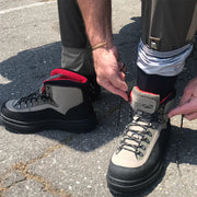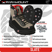 The Slate Felt wading boots give you the stability, traction, and durability you need and expect in a quality fly fishing wading boot. Coupled with a full wrap rubber reinforcement strip plus large rubber heel reinforcement these wading shoes are ready for any terrain. Additionally, the stiff midsole provides a solid step every time. The Slate felt sole fly fishing boots also feature recessed stud insert points to maximize traction while keeping your studs in place. Lastly, steel Slick Eddy studs are included, these felt wading boots can be worn with or without studs.