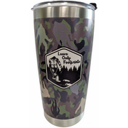 A durable double-walled insulated stainless steel tumbler with spill proof lid. The Leave Only Footprints green camo tumbler features artwork on two sides; Leave Only Footprints and Department of Sasquatch Forest Service. The camouflage pattern is bigfoot themed. The bottom is etched with the Squatch Metalworks logo.