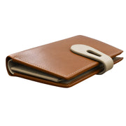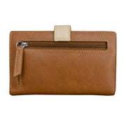 This smooth leather wallet in Antique Saddle Stone blends classic style with practical features. It has a secure tab closure, a deep currency pocket, 17 credit card slots, and three slip pockets to keep you organized. The ID window with a thumb slide makes access easy, while the back zip pocket and RFID-blocking lining protect your essentials. Compact and convenient, it measures 5.5" x 3.75" x 1", perfect for everyday use.