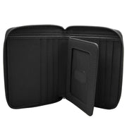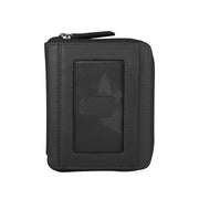 This Small Zip Around Wallet in classic black is made from smooth leather and features RFID blocking for added security. It includes an exterior ID window, a back zip pocket, and inside, another ID window, credit card slots, and an open pocket for cash. Compact at 4.5" x 4" x 0.5", it's the perfect blend of style and functionality for your everyday essentials.