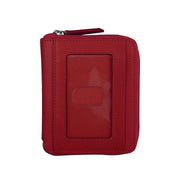 This Small Zip Around Wallet in vibrant red is crafted from smooth leather and features RFID blocking for enhanced security. It offers an exterior ID window, a back zip pocket, plus an interior with an additional ID window, multiple credit card slots, and an open pocket for currency. Compact and convenient at 4.5" x 4" x 0.5", it’s perfect for keeping your essentials organized on the go.