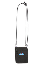 Passport wallet pouch, adjustable swift rope neck / cross body strap construction with cord lock cinch and metal d-ring hardware, main compartment with zip closure and back stash pocket (can hold passport, phone, cards, and receipts), rope loop zip pull and pattern webbing details.