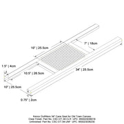 Kenco Outfitters solid ash cane canoe seats for Old Town canoes are 10" wide x 34" long. The 34" seat has a 10" x 13" seating area, and the rail centers are 8-1/2". They are assembled with mortise and tenon joinery. Our unfinished seats are sanded and ready for your choice of stain, polyurethane or other finish. Each canoe seat is handcrafted in the United States.