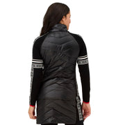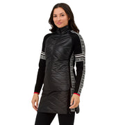 The Women's Switchback Jacket in Black Glacier strikes the perfect balance between stretch and structure for versatile wear, whether you're on the lift or out in town. Crafted from fully recycled polyester, it offers warmth and reliable weather protection, while the silky-soft LENZING™ ECOVERO™ Viscose trim adds sustainable comfort and style. This 25" insulated knit hybrid jacket features patterned knit sleeves and side panels, a full-length zipper, and zipper hand pockets for convenience. Pair it with the Carving Skirt for a polished, cozy outfit ready for any chilly adventure.