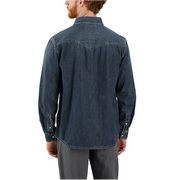A work-day staple, this men's western denim shirt is ready for the shop, the farm, or the weekend. It's made in midweight cotton denim with adjustable snaps at the cuffs. A relaxed fit offers a little extra room to move.