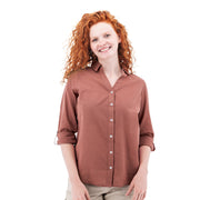 It was no mistake Old Ranch Brands named this top the Plumas Organic Roll-Up Shirt. Translated into English, plumas means feathers. This top not only embodies the lightness and softness of a feather but also carries the strength of one. Woven from 100% organic cotton, this shirt has a natural, soft structure and durability. Wear this top season after season and enjoy its sharp, tailored look even on your most casual days. Classically styled, this shirt features a full-button front, an inverted pleat on the back yoke, a feminine Y-neck, and roll-up sleeves with a tab.