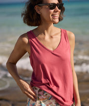 The Bali V-Neck Tank is an easy-wear sleeveless tee, ideal for daily activities in the warmer months. Helping to reduce landfill waste, durable recycled polyester blends with Tencel™ and organic cotton, for soft-to-skin, quick-drying comfort and versatility. With a wide, gently curved V-neck, and cut with a classic fit, the beautiful drape of the fabric provides a feminine silhouette. Overlapping yoke detail at the back is thoughtfully finished with sherpa's signature endless knot coin, signifying eternal unity. Effortlessly paired with shorts, pants, or a skirt, this vest provides the perfect day-to-night transition piece. Far from basic, the Bali V-Neck Tank delivers simple dressing and elegant style.