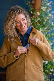 The Women's Old School Trucker Canvas Work Jacket in Vintage Brown delivers classic style with a fit made for action. Constructed from heavy-duty duck canvas and lined with cozy faux shearling, it keeps you warm without sacrificing mobility. Bi-swing back pleats and reinforced elbows provide extra room and durability, while a corduroy collar, snap front and cuffs, zip chest pocket, and inner pocket add practical details. Smooth-lined sleeves make it easy to slip on and off, making this jacket a reliable, stylish choice for hardworking women.