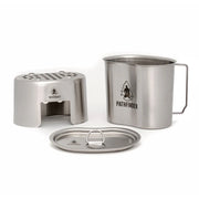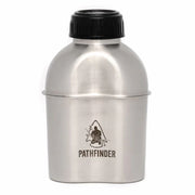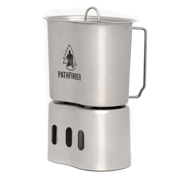 Whether you are a hiker, hunter, prepper, extreme outdoor enthusiast, or serving a tour of duty, you are one mechanical injury away from finding yourself in a survival situation. Your two primary concerns are always going to be hydration and core temperature regulation, that is why this kit is a must-have in your pack. The Pathfinder Wide-mouth Canteen Cooking Set was designed so the canteen will nest inside the cup along with the stove for convenient and compact storage. Continuing to raise the bar, Pathfinder has developed the ONLY wide mouth stainless steel military canteen on the market today. The wide-mouth design allows you to easily obtain water from shallow water pools, providing far more opportunities to procure water if necessary. The strong Single Wall construction can withstand direct fire or can be placed directly in coals for the purposes of boiling/disinfecting water. The nesting cup has folding Batwing handles that securely fastens the stove to the cup when not in use and has measurement graduations on the inside.