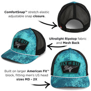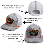 The Fly or Die fly fishing cap on our Riverside 6-panel mesh back style. Coupled with our Comfort Snap stretch elastic snapback for the stretch of elastic and adjustability of a snapback. Additionally, the fly or die hat features our American Fit sizing that fits men's head sizes MD - XX. Combine our Comfort Snap with our American Fit and these caps are a better fit for big heads. Lastly, if you are looking for the best fly fishing hats and most unique designs we have you covered. Fly or Die hat
