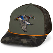 This Flying Wood Duck Hat is on our Ridgeline 5-Panel Trucker hat style with mesh back. Coupled with a structured front panel and old school camo visor. Additionally, our COMFORT SNAP™ elastic snapback closure which combines the stretch fit of a custom cap with the adjustability of a snapback. Lastly, this flying wood duck hat features American Fit™ sizing which fits men's head sizes MD - XX.