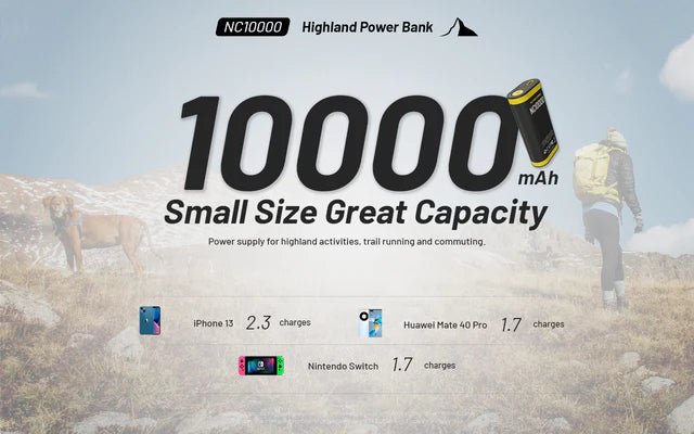 The Nitecore NC10000 highland power bank is a blend of portability, reliability, and power for the toughest climates in the world. Whether you're a professional mountain climber, or just someone that lives up high, like in Denver; the NC10000 provides the ability to charge a modern smart phone 3 times over at blazing speeds with its 20W QC/PD compatibility. The single integrated USB-C port not only dishes out the juice, but is used to fully recharge the NC10000 in two and a half hours. The smart quad LED power level display gives you real time info on battery status to plan for trips in advance. The NC10000 is a great addition to anyone's go-bag or emergency kit. The NC10000 comes with an emergency dual LED backup flashlight that can run for over 30 hours. An excellent tool to help you find things in the dark when camping, hiking, or for roadside emergencies. This lightweight, extremely portable power bank is designed to withstand the harsh temperatures of higher altitudes and resist thermal expansion and shrinkage. This not only protects the NC10000 but also your precious electronics from any devastating loss of power, short circuit, and overcharge, overheat etc electrical problems. Additionally, the NC10000 is rated IPX5 water resistant so it can even perform in the rain! Whether it is a once in a lifetime trip, or the everyday grind, don't leave home without the NC10000.