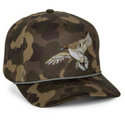 This Pintail Duck Hat is on our Ridgeline 5-Panel Trucker hat style features dark old school camo. Coupled with a structured front panel and performance sweat wicking fabric. Additionally, our COMFORT SNAP™ elastic snapback closure which combines the stretch fit of a custom cap with the adjustability of a snapback. Lastly, this pintail duck hat features American Fit™ sizing which fits men's head sizes MD - XX.