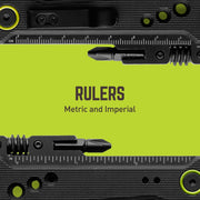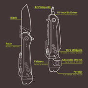 The SMARTKNIFE WR 8-in-1 Multitool Knife is your pocket powerhouse. At its core sits a 2.5" black oxidized Sheepsfoot blade, perfect for everyday cutting tasks. But that's just the beginning—wrapped around it you'll find an adjustable wrench, calipers for precise measurements, a magnetic 1/4" bit driver for fasteners, wire strippers for electrical work, rulers for quick measurements, a flat driver for screws, and a pry bar for leverage. It's eight tools in one compact package that handles everything from repairs to adjustments without weighing you down.