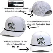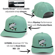 The Tarpon performance sport fishing hat is built on our Base Camp 5-Panel rope cap style. This saltwater fishing cap features laser perforated back panels with a structured front and a slightly curved visor. Constructed with lightweight micro ripstop quick dry performance fabric ideal for hot days on the casting deck. Our COMFORT SNAP™ snapback closure combines the stretch of elastic with the adjustability of a snapback, allowing for a custom stretch fit. Lastly, this tarpon hat features our American™ Fit sizing that fits men’s US head sizes MD – XX.